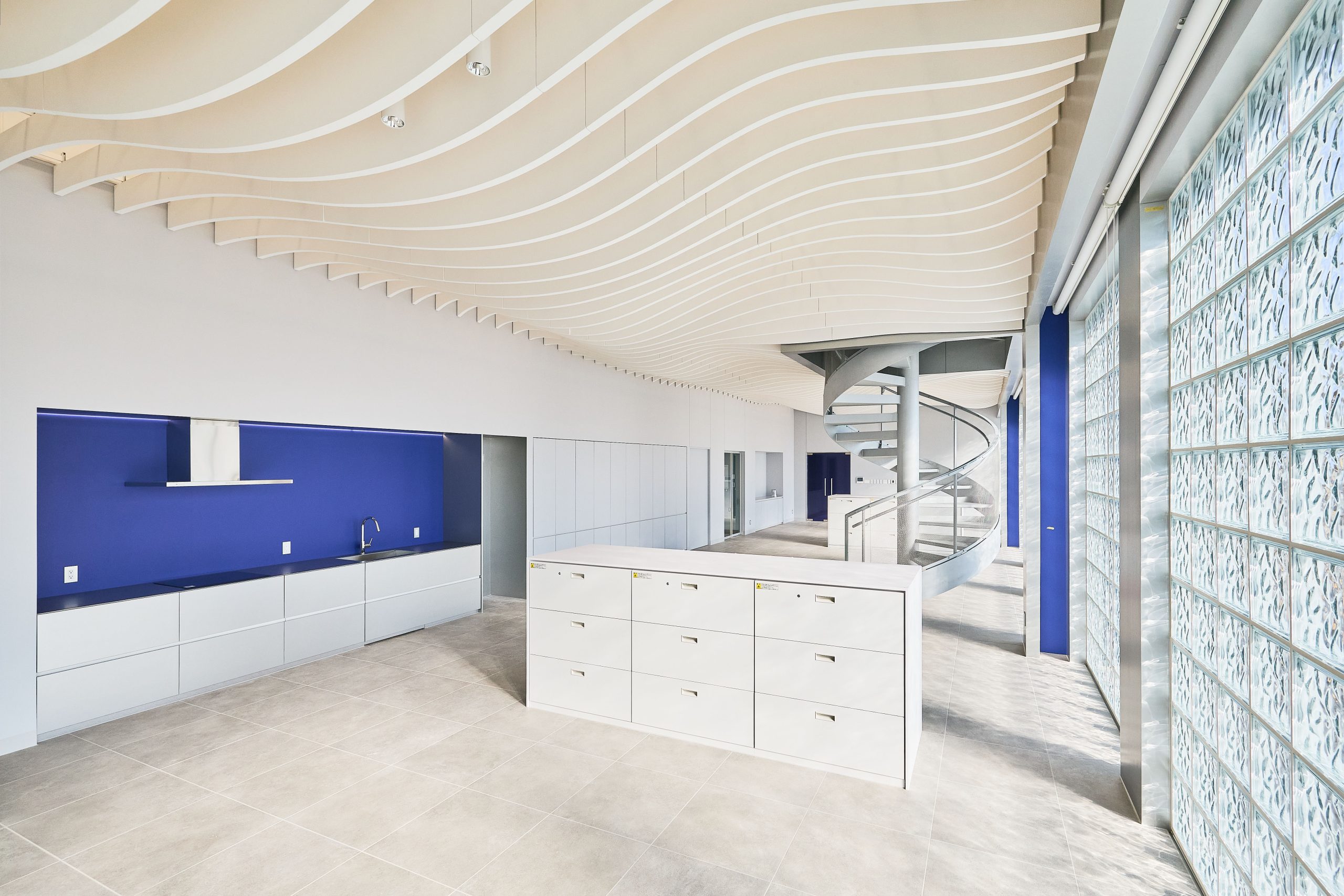 天井の波型ルーバーはもちろん、壁面にも曲線を取り入れることで空間全体に自然な柔らかさを持たせ、テーマカラーを絞り、家具や建具にマリンブルーを配することで統一感を生み出しました。結果、印象的でありながらシンプルにまとめるデザインによって、オフィスを訪れるゲストに忘れられない体験を提供する空間が完成しました。