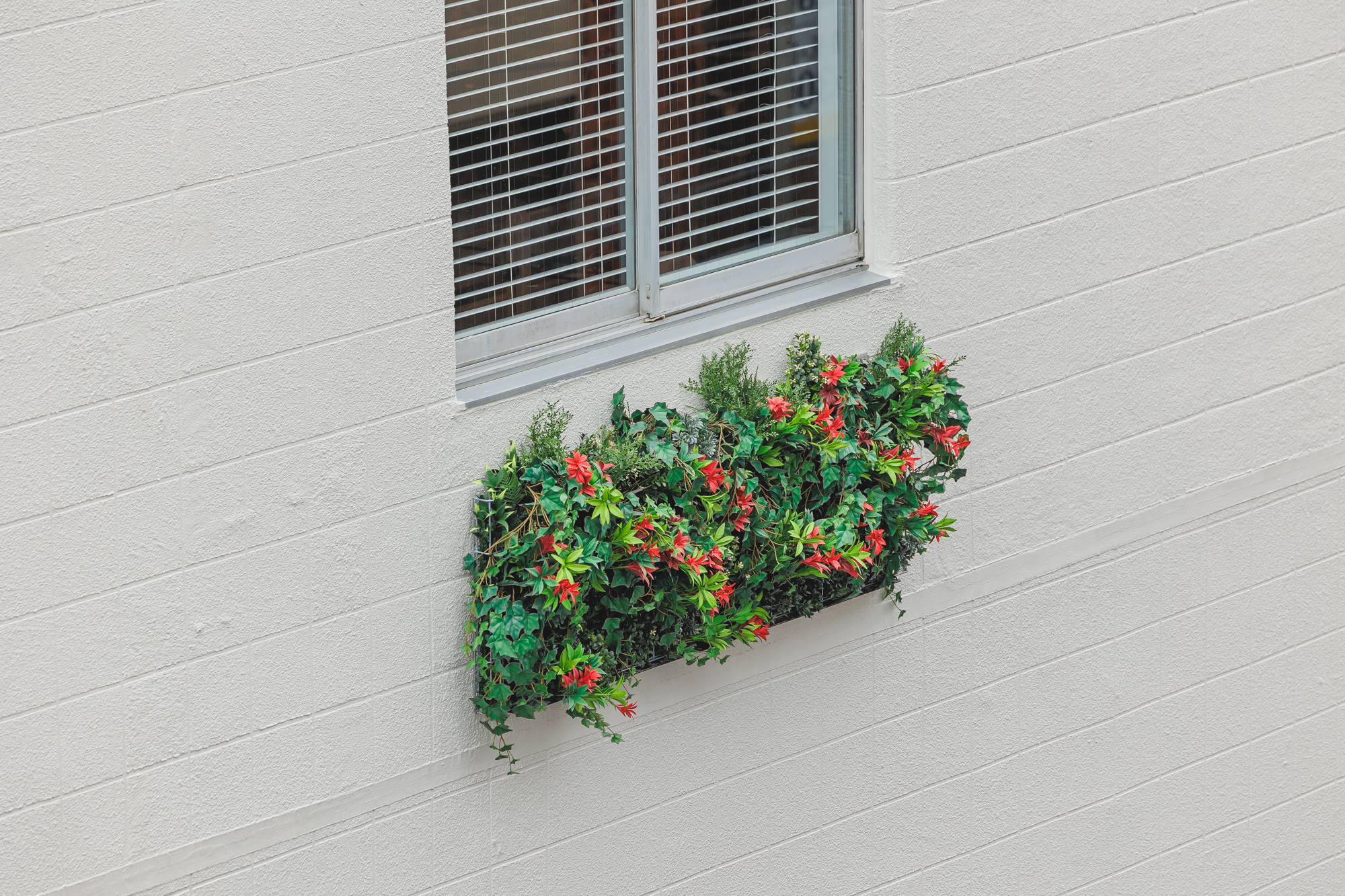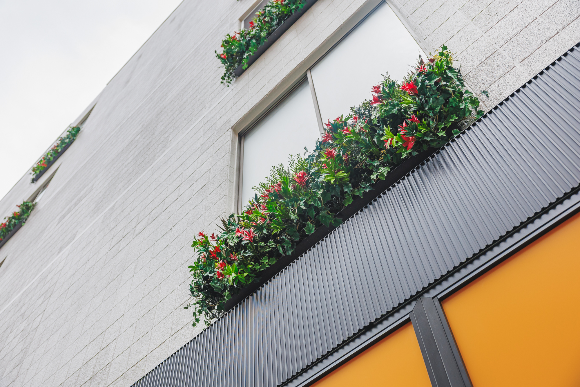 ファサードを彩る人工壁面緑化パネルとブラケット