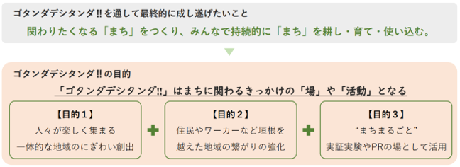 本イベントは、まちに関わるきっかけの「場」や「活動」となることで、①にぎわいの創出、②住民やワーカーなどの垣根を越えた地域のつながりの強化、③“まちまるごと”活用、の3点を目的に、多くの人が持続的に「まち」に関わることを目指す取り組みです。