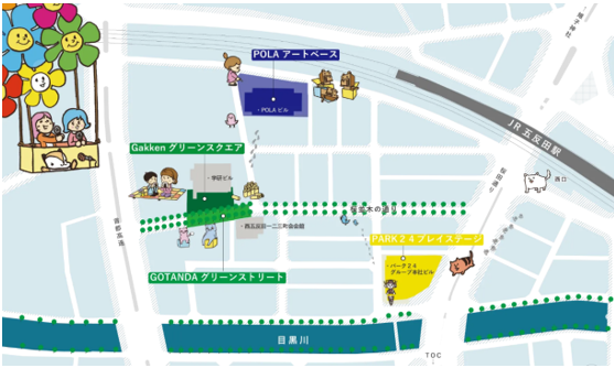 東京都品川区西五反田二丁目地区 ①区道Ⅰ-62号、②学研ビル公開空地、③ポーラ本社ビル、④パーク24グループ本社ビル