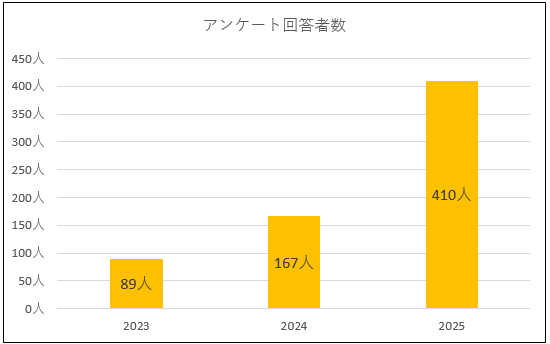 2023年より2会場・参画団体11団体でスタートした本イベントは、2024年に3会場・13団体、2025年に4会場・21団体と拡大。また、回答任意による来場者アンケートの集計数も2023年89名、2024年167名、2025年は410名と参画団体及び来場者数共に広がりを見せています。