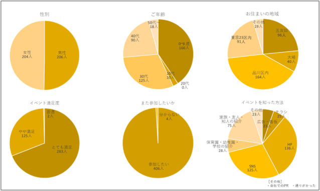 来場者の傾向としては品川区内を中心に0-9歳の子育て世代が中心で満足度が非常に高く、410名のうち、99%の方に【とても満足~やや満足】、【また参加したい】と回答を得ました。